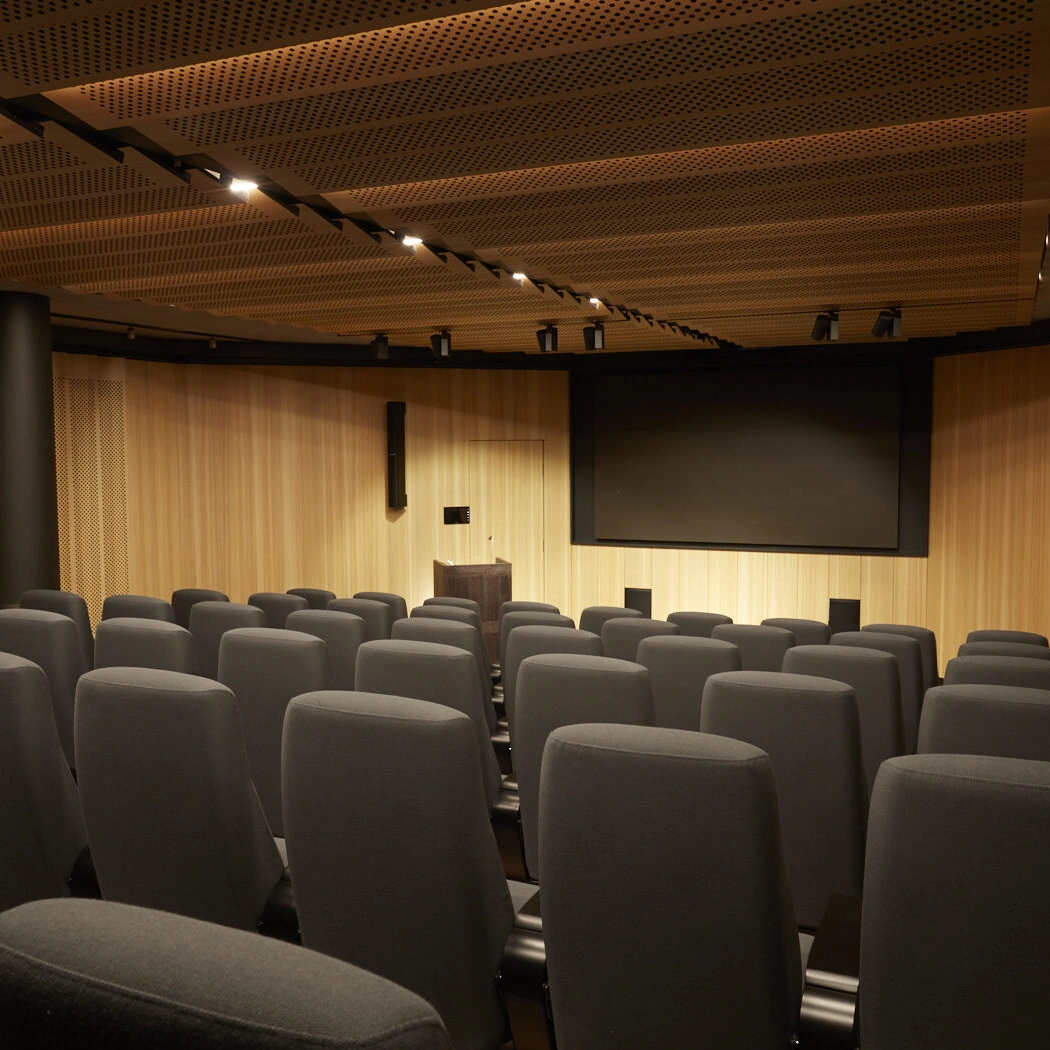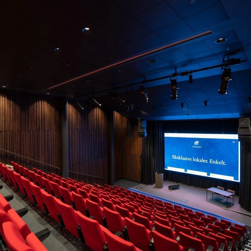 Fantastisk auditorium i 2 etg. med 146 faste sitteplasser, i tillegg er det tre benker øverst i lokalet hvor ca 20 kan få plass. Topp moderne teknisk utstyr med profesjonell sceneteknikk og lys. Videokonferanseutstyr. Tilrettelagt for teknisk utstyr til eventarrangører. Store minglearealer rett utenfor over to etasjer med tilhørende garderobe og toaletter. Kaffe, te og Pure Water i mingleområdene.