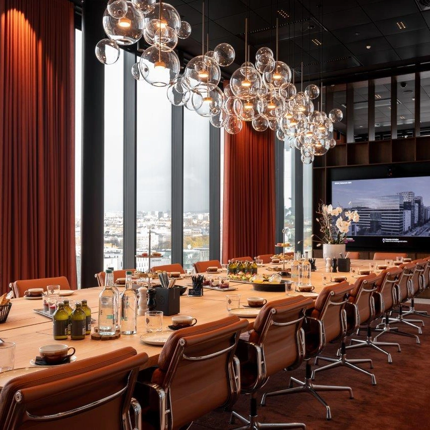 Møterom langs vestfasaden i 13. etg. Flott utsikt over Oslo sentrum med tilhørende lounge rett utenfor. Rommet er utstyrt med fullt videokonferanseutstyr og inkluderer en servering med kaffe, te og Pure Water ved møtestart. Rommet egner seg godt i kombinasjon med lunsj i skybaren.