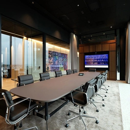 Stort og lyst møterom med utsikt østover mot Barcoderekken med lounge rett utenfor. Rommet er utstyrt med fullt videokonferanseutstyr og inkluderer kaffe, te og Pure Water.