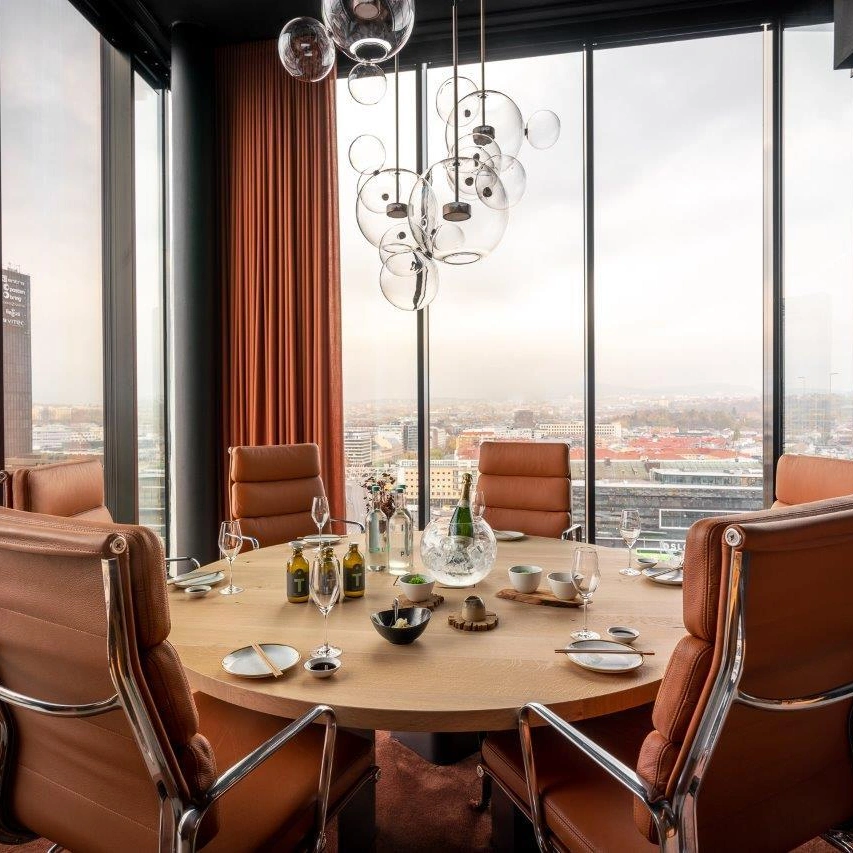 Stort møterom for de viktigste møtene. Glassfasaden med sine fire meter takhøyde sørger for god utsikt over byen og marka. Rommet er møblert med massivt trebord med plass til 22 til møte og 24 til middag. I rommet finner du også egen lounge med anretning. Det er utstyrt med fullt videokonferanseutstyr og inkluderer en servering med kaffe, te og Pure Water ved møtestart. Rommet egner seg godt for en privat forretningslunsj, eller i kombinasjon med lunsj i skybaren.
